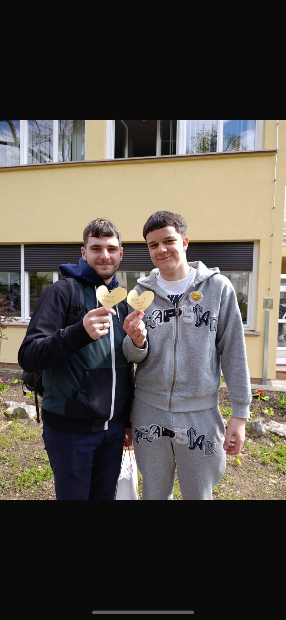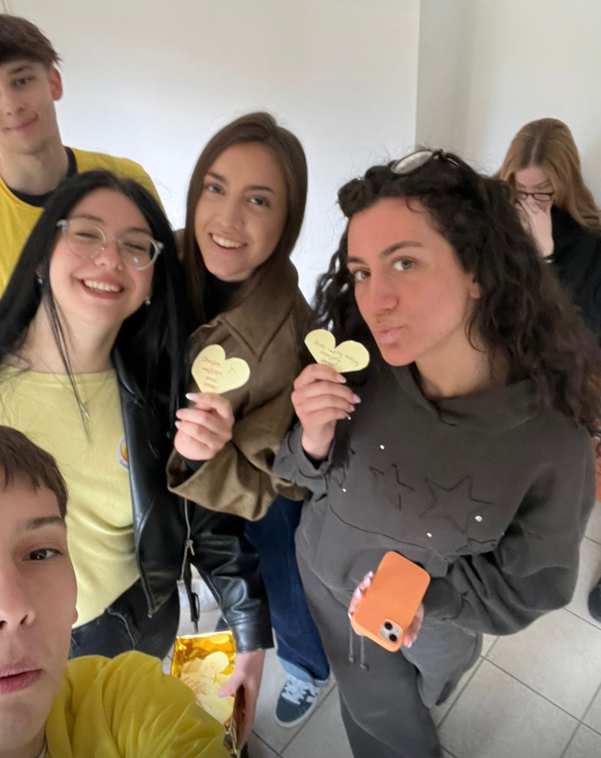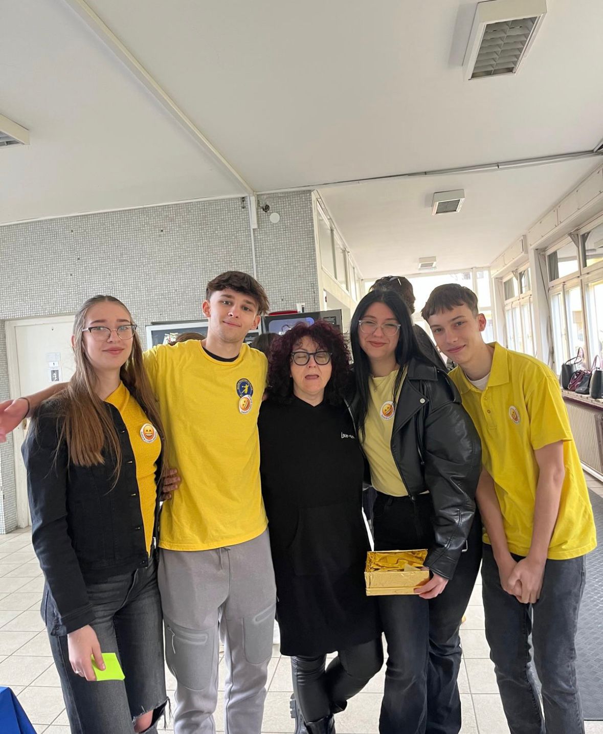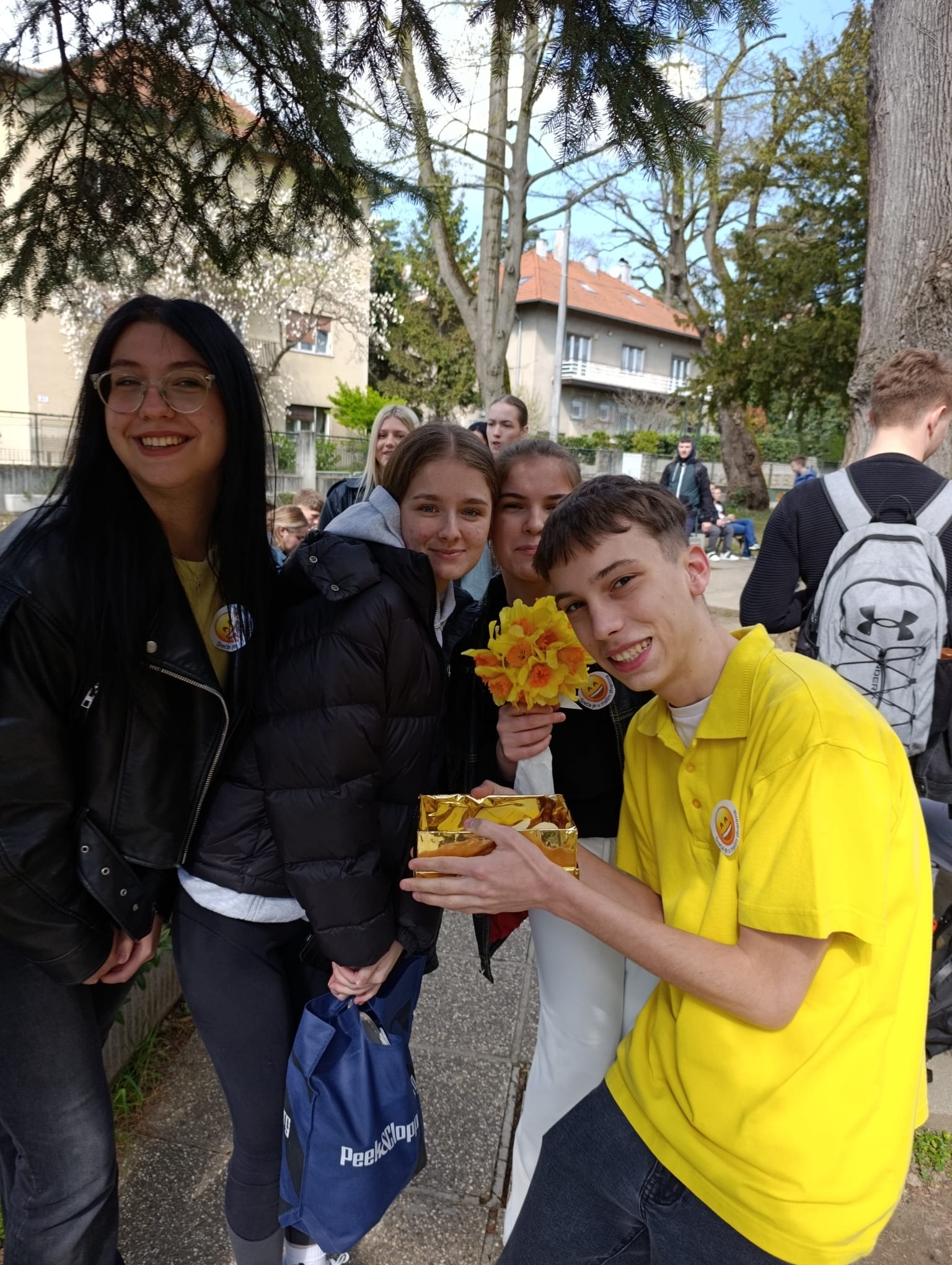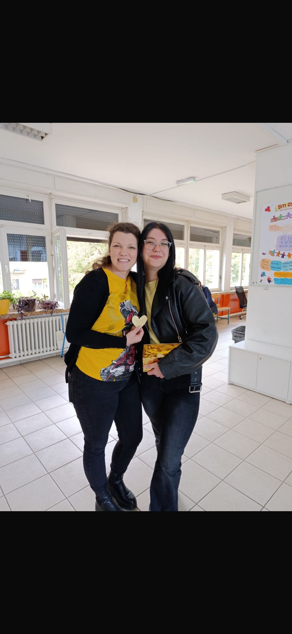 Osim toga, dio učenika obilazio je školu s kutijom u kojoj su se nalazili papirići žute boje u obliku srca s različitim pozitivnim porukama. Te smo poruke dijelili učenicima i profesorima uz osmijeh, čime smo željeli proširiti pozitivno raspoloženje i potaknuti ugodnu atmosferu u školi.