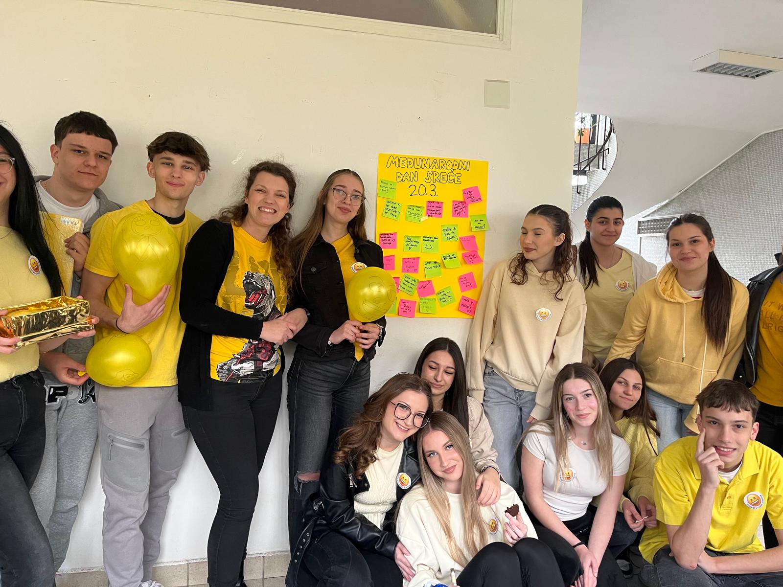 Učenici 3.b razreda aktivno su sudjelovali u obilježavanju ovog dana kroz niz prigodnih aktivnosti. Nosili smo žute majice, budući da je žuta boja simbol sreće i optimizma. Također, razred nosio je bedževe s natpisom „Sreća je u malim stvarima“, čime smo dodatno naglasili poruku koju smo željeli prenijeti.