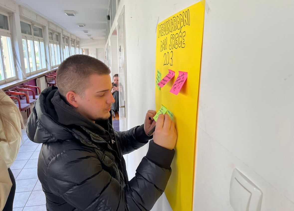 Tijekom aktivnosti zaustavljali smo učenike i profesore te ih zamolili da na papiriće napišu što za njih predstavlja sreću. Njihove odgovore lijepili smo na zajednički plakat koji je tijekom dana postajao sve bogatiji raznolikim i inspirativnim porukama. Ova aktivnost potaknula je razmišljanje o važnosti malih, svakodnevnih trenutaka koji doprinose osjećaju zadovoljstva i blagostanja.