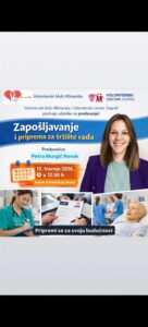 Predavanje na temu „Zapošljavanje i priprema za tržište rada“ održat će predavačica Petra Murgić Novak. Tijekom predavanja učenici će imati priliku dobiti korisne informacije o mogućnostima zapošljavanja, pripremi za ulazak na tržište rada, razvoju profesionalnih vještina te savjete koji će im pomoći u planiranju buduće karijere.